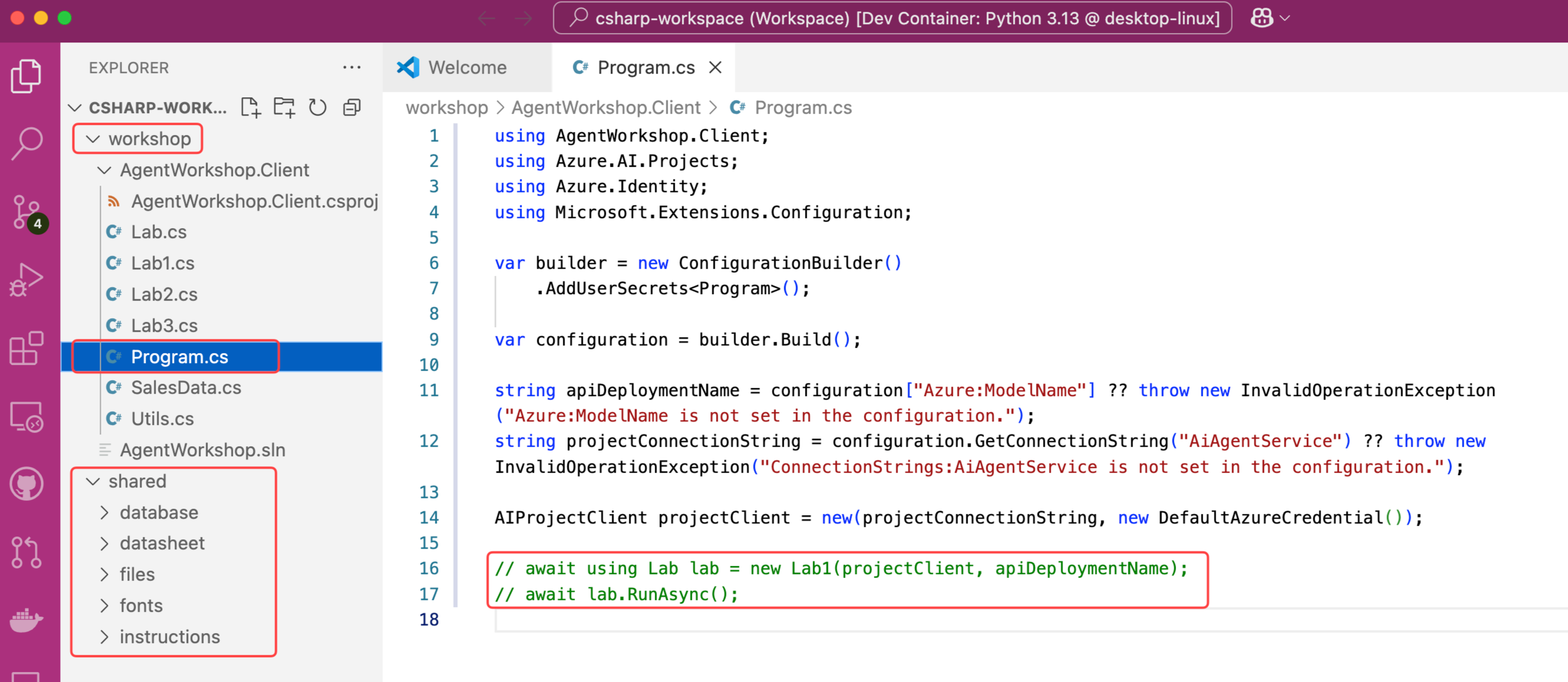 There are two workspaces in the workshop, one for Python and one for C#. The workspace contains the source code and all the files needed to complete the labs for each language. Choose the workspace that matches the language you want to work with.